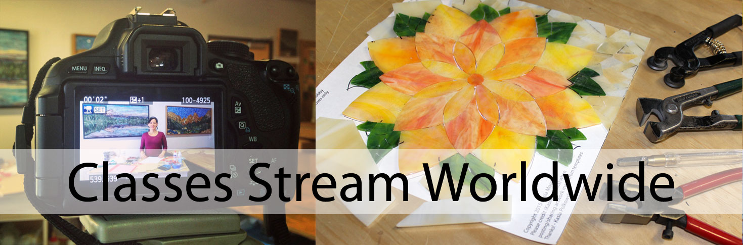 Watch this short time-lapse to get a glimpse into the stained glass mosaic process that Kasia introduces and teaches in her Online Stained Glass Mosaic Flower Class. This is one of the 12 flower designs included in the class.